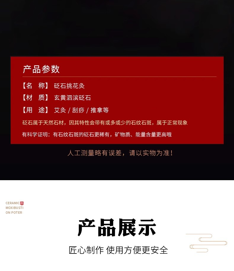 天然砭石艾灸罐在追求功效的同時,更將安全性放在首位。其採用科學合理的結構設計,配備專業防燙裝置,從根源杜絕燙傷風險,讓你使用過程安心無憂。生產全程嚴格遵循高標準,每一處細節都經過層層把關,品質堅如磐石。無論是自用呵護肌膚,還是作為體貼溫暖的禮物送給親朋好友,都是不可多得的絕佳選擇,帶你開啟健康美容的嶄新體驗!